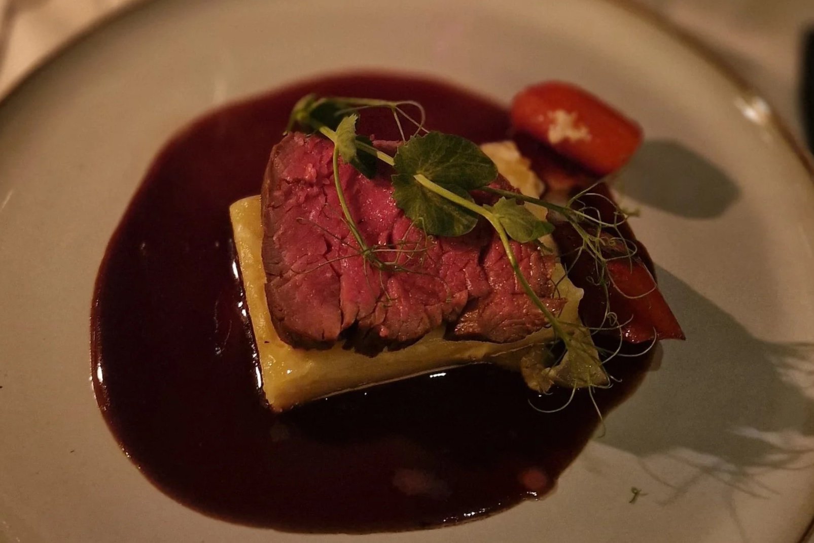 Beef fillet ~150g, Potato Cake with Västerbotten-cheese, Honey-glazed Vegetables, Red Wine Sauce